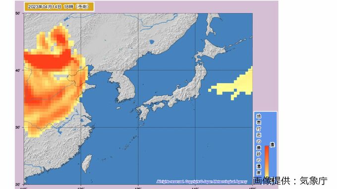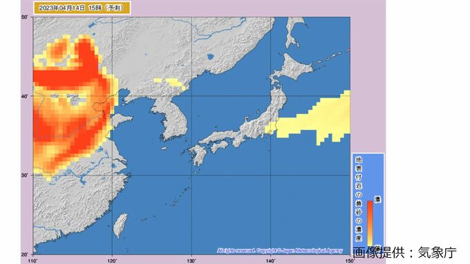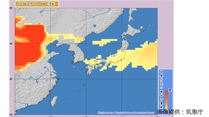 気象庁の「黄砂解析予測図」では、国内の一部地域では14日(金)午後まで黄砂の飛来が続く予測が出ているほか、15日(土)夜には、次の黄砂の飛来も予測されています。