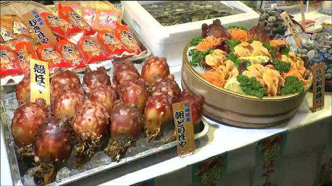仙台市中央卸売市場では、13日朝、ホヤやアサリを使った料理が、関係者に振る舞われました。今シーズンのホヤは5年物が多く入荷していて身が肉厚で甘味があるということです。