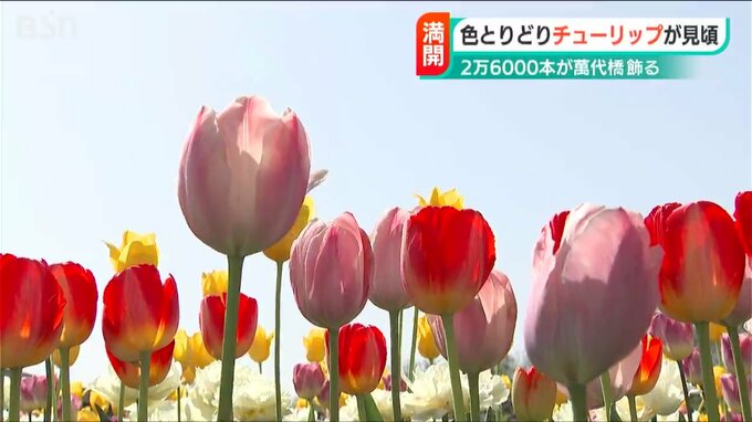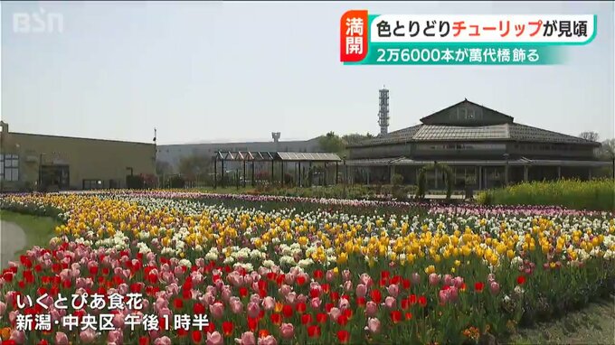 春の柔らかい日差しを受けて、色鮮やかに咲くチューリップ。新潟市中央区のいくとぴあ食花では3万本のチューリップが見ごろを迎えています。