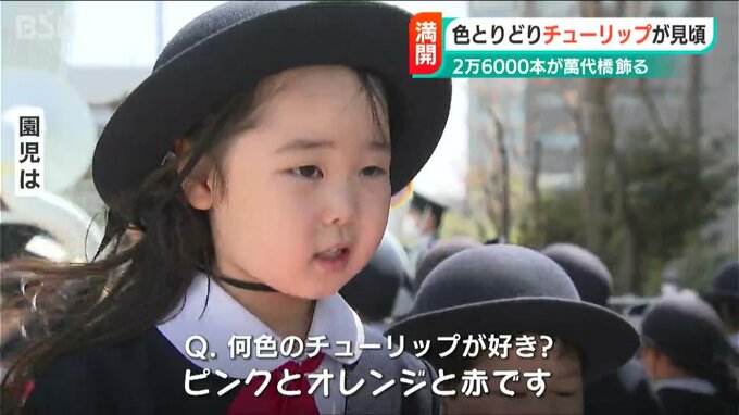 「きれいです。Q何色のチューリップが好き?ピンクとオレンジと赤です」