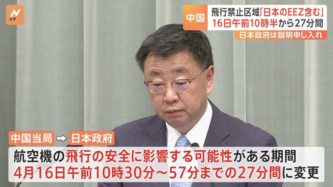 松野官房長官は、中国当局が設定した航空機の飛行の安全に影響する可能性がある区域について、期間が変更されたことや、日本のEEZ=排他的経済水域の上空が一部含まれていることを明らかにしました。松野官房長官「…