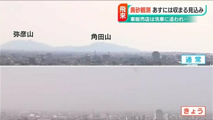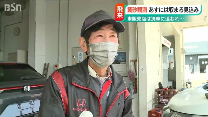 12日に新潟県内で観測された黄砂。13日も引き続き観測され、車の販売店は対応に追われました。