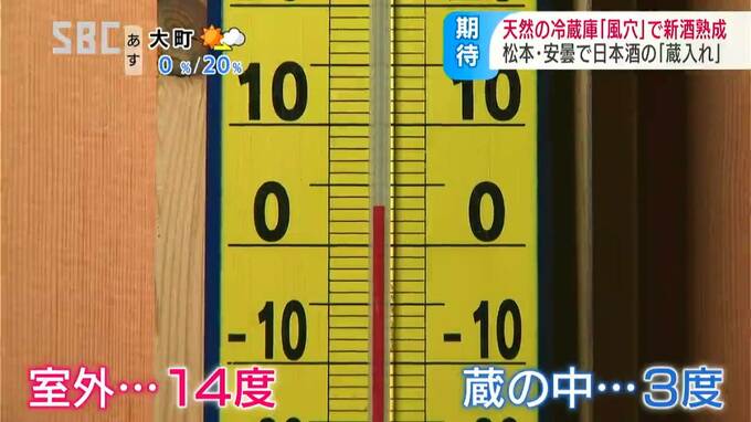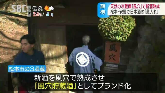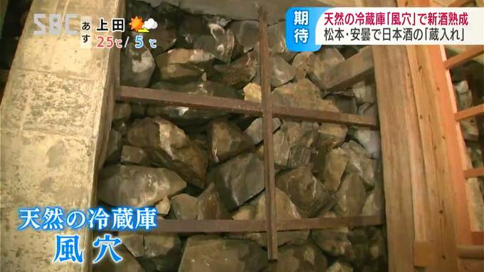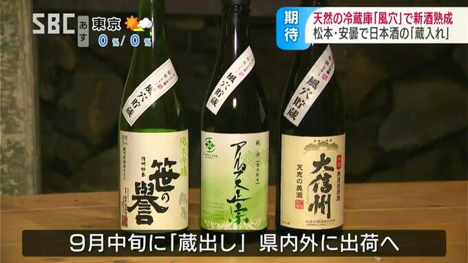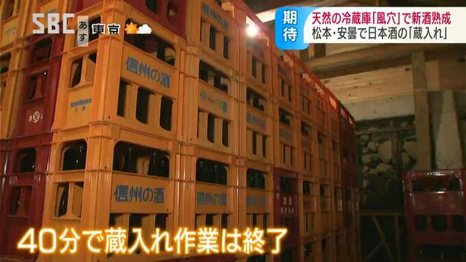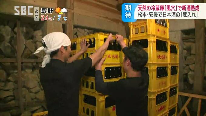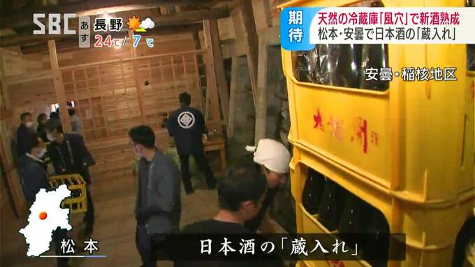 松本市内の3つの酒蔵では、新酒を風穴で熟成させ「風穴貯蔵酒」としてブランド化していて、13日は純米酒と純米吟醸酒およそ4400本が運び込まれました。