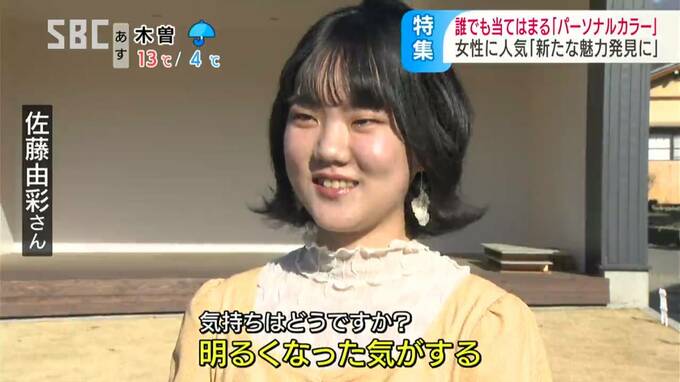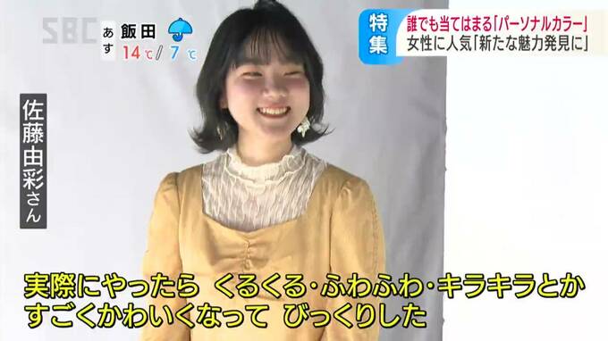 ■佐藤由彩さん「カラー診断が終わった時はこの色味が本当に似合うのかなと思ったが 実際にやらせてもらったら くるくる・ふわふわとか・キラキラとかすごくかわいくなってびっくりした (気持ちはどうですか?)明るくなった気がします」