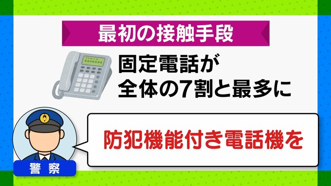 被害者への最初の接触手段ですが、全体の7割以上が固定電話に電話を掛けています。そのため、自動で録音ができる防犯機能付き電話が有効な対策だとして、警察は導入を呼びかけています。