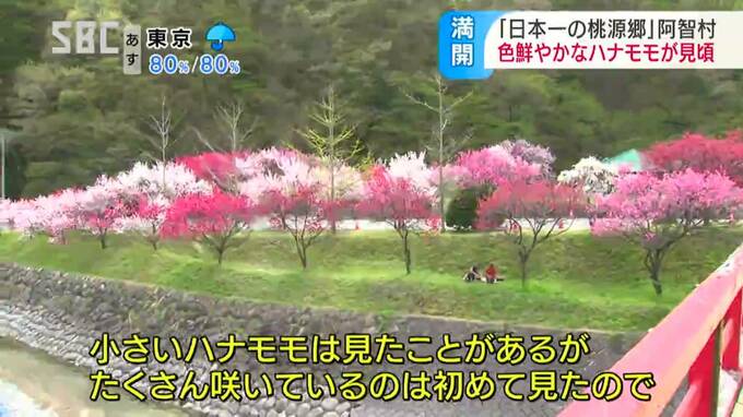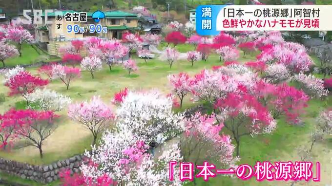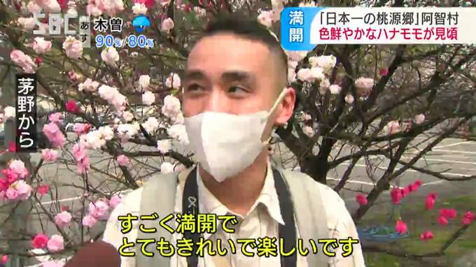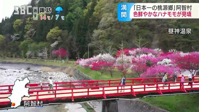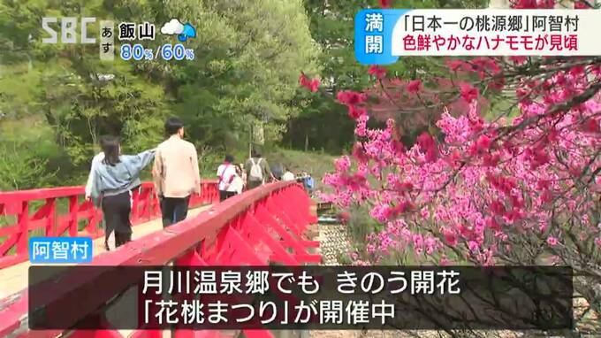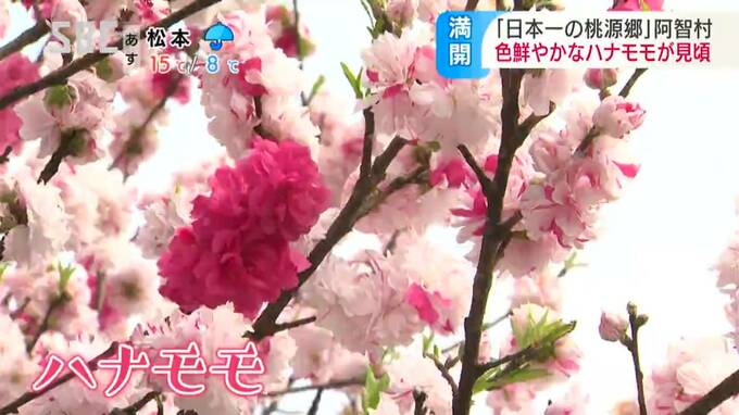 南信州では、色鮮やかなハナモモが見ごろを迎え、大勢の観光客が訪れています。