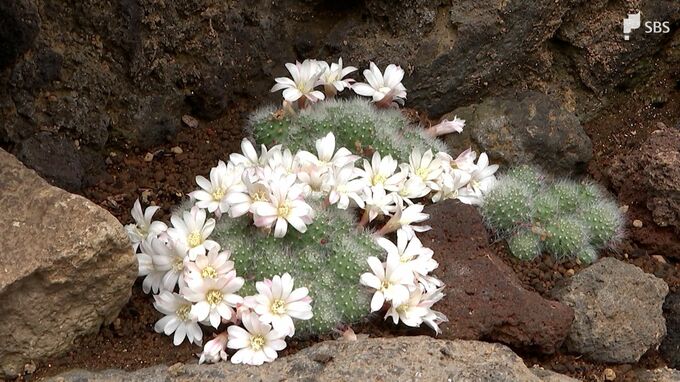 「白雪姫というレブチアです。レブチア属にしては珍しい白い色を咲かせます。伊豆シャボテン動物公園で新しく植え込んだばかりのサボテンです。白花のレブチアというのは私の知る限りでは初めて見たものです。いずれも可憐な花をラッパのようにサボテンの横から咲かせるのが特徴です。とてもかわいいものです。世界にはこんな不思議な植物もあるんだという、現地のサボテンが生えている雰囲気を想像しながら世界の不思議さを味わってもらえたらありがたいと思っています」