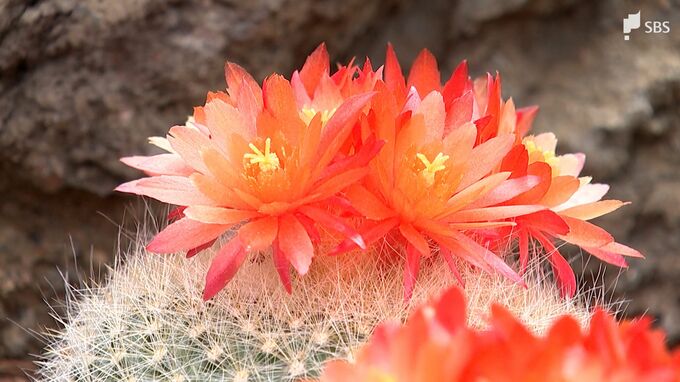 「たくさん咲いております。こちらは『雪晃(せっこう)』という名前のサボテンです。このオレンジ色のろうそくを灯したような鮮やかな花が特徴のサボテンです。ちなみに「セッコウ」というのは雪に晃ると書きまして、この白いとげが雪みたいに白い形からこの名前がついています。ブラジルあたりに咲いているサボテンですね。このセッコウは特に乾燥したところに生えているのですが、1年のうちごくわずかに雨の降る時期、雨期がございます。サボテンたちはその雨期になってくると花を咲かせて来るようになるのです」