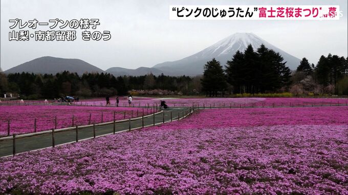 山梨県の富士山の麓でシバザクラが”ピンク色のじゅうたん”のように広がる「富士芝桜まつり」が開幕しました。山梨県の富士本栖湖リゾートでは色鮮やかなシバザクラが広大な敷地に咲き誇る「富士芝桜まつり」が4月…