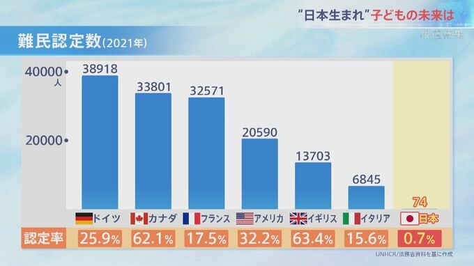 比較可能な2021年のデータによると、日本で難民と認定されたのは74人で、認定率は0.7%。先進6か国と比べると認定数・認定率ともに極端に低い。