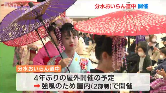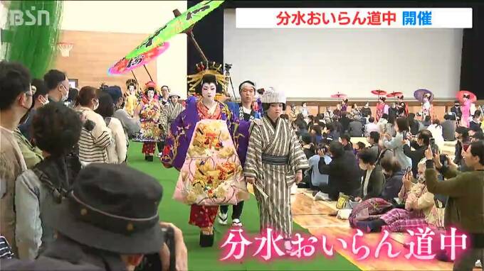毎年4月に開かれる『分水おいらん道中』。ウイルス禍で叶わなかった桜並木のもとでの開催が4年ぶりに期待されていましたが、強風のため屋内で2部制にして開催されました。主役は豪華絢爛な衣装に身を包んだ3人のおいらん役。公募した30人余りの中から選ばれました。