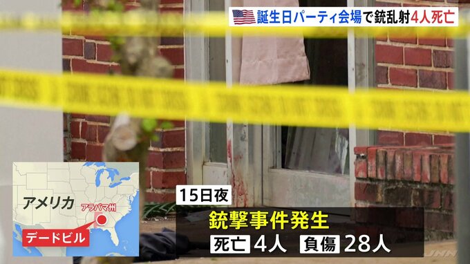 アメリカ南部・アラバマ州で15日、16歳の少女の誕生日を祝うパーティー会場で銃撃事件があり、これまでに4人が死亡しました。事件が起きたのは、南部アラバマ州の人口3000人あまりの小さな町デードビルで、現地時間…