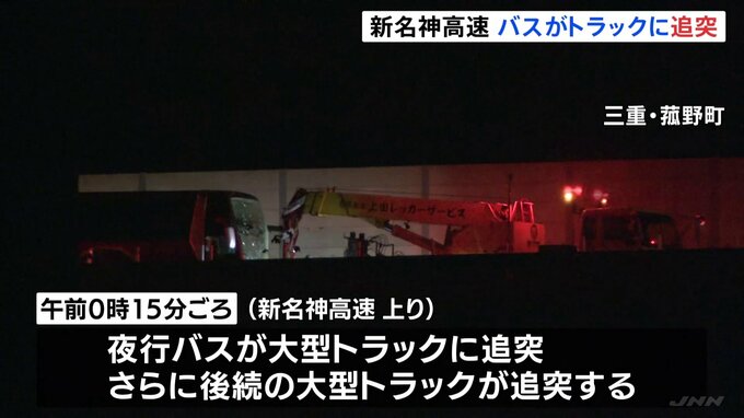 夜行バスの乗客ら13人が軽傷です。きょう午前0時過ぎ、三重県菰野町の新名神高速道路の上り線で、夜行バスが大型トラックに追突し、さらに後続の大型トラックが追突しました。この事故で、バスの乗客20人のうち10…