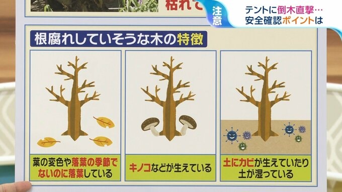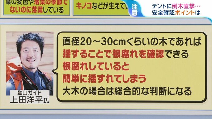 見分けるのは難しいなと思いますね。特に管理されてるキャンプ地ですから、キャンパーの安全を配慮する義務が事業者の方にありますので、やはりテントを張っていい場所は基本的に安全だというふうに受け止められると思います。
