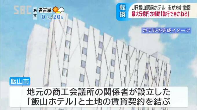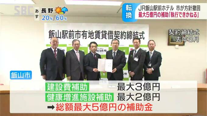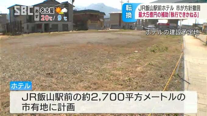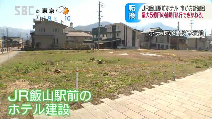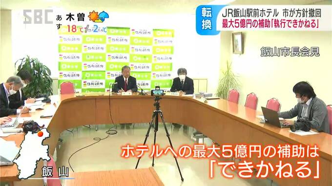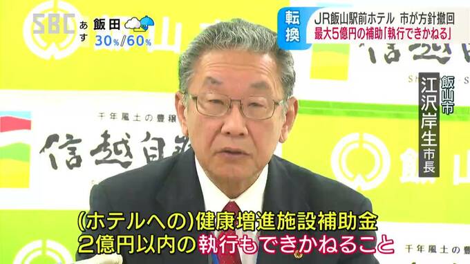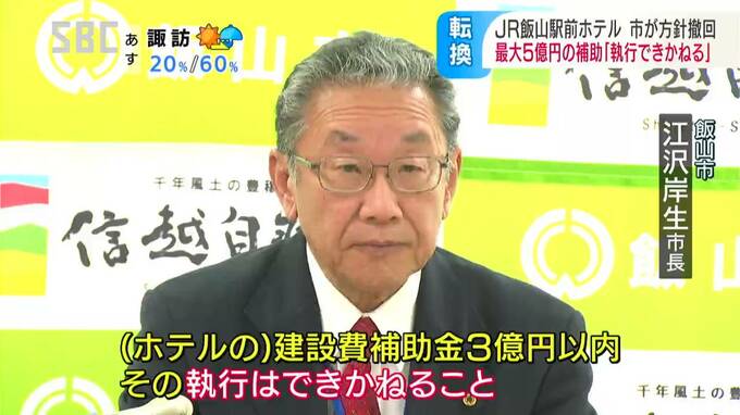 JR飯山駅前に計画されているホテルの建設について、江沢岸生(えざわ・きしお)市長は17日、市が予定していた最大5億円の補助金を支出しない方針を示しました。