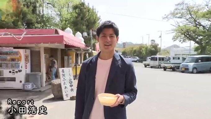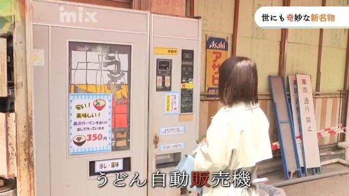 「長沢ガーデンにやってきました。ここに来たらやっぱり、自販機のうどんですよね。ん?なんですかこれ?うどん自販機のだし味?!」