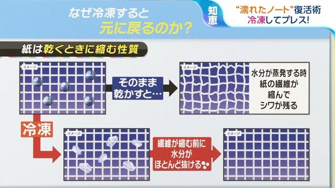 紙は乾くときに縮む性質があります。そのまま乾かすと、水分が蒸発するときに紙の繊維が縮んでシワが残ってしまいます。