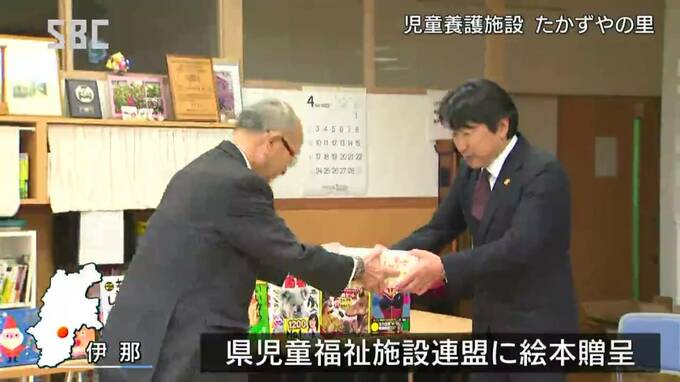 伊那市の児童養護施設で行われた贈呈式では、協賛企業から、県児童福祉施設連盟の川瀬勝敏(かわせ・かつとし)会長に絵本が贈られました。