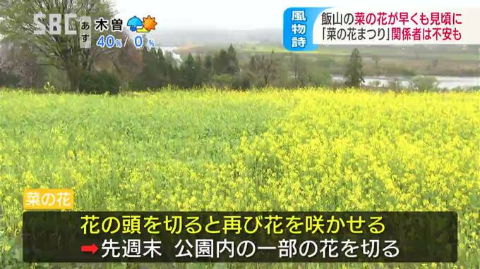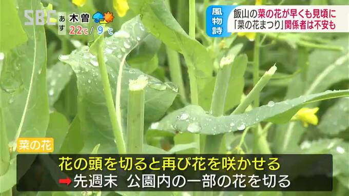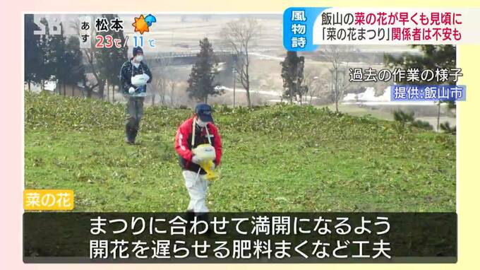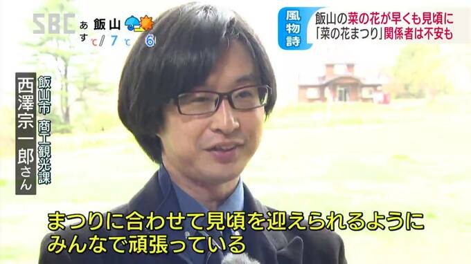 ■飯山市商工観光課 西澤さん「菜の花まつりの時に花が全然ないもの寂しいので、一度花の頭を刈って5月の3日から5日に見ごろが合うように調整はしてもらった」