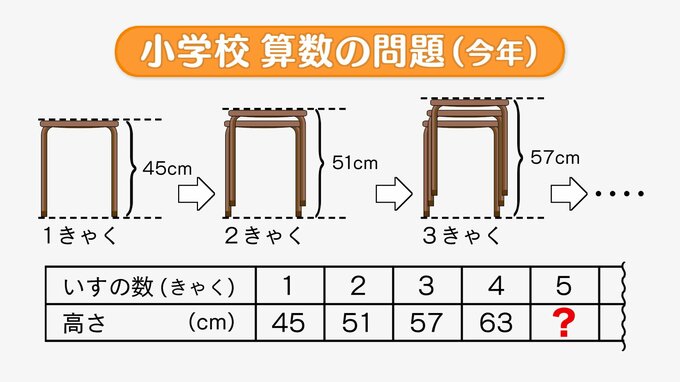 1脚の高さが45cmのいすがあります。2脚合わせると51cmと高さが変わります。いす5脚を重ねた際に高さは何cmになるでしょうか?