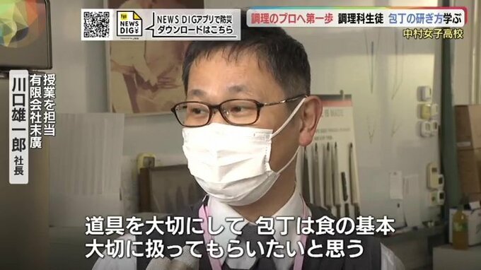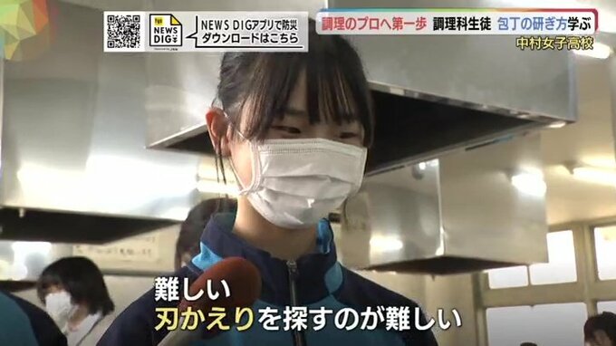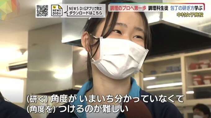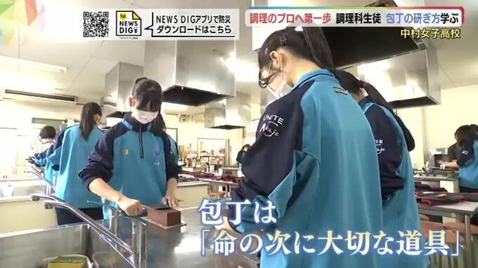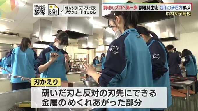 包丁の研ぎ方を学んだのは、中村女子高校の調理科の1年生およそ30人です。