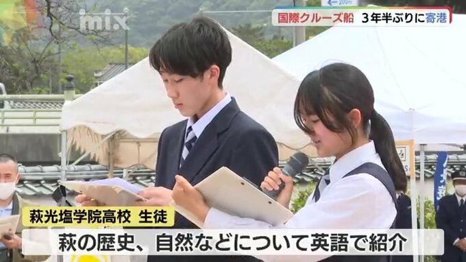 フランス船籍の客船「ル・ソレアル」が山口県萩市に寄港し、歓迎のセレモニーがありました。