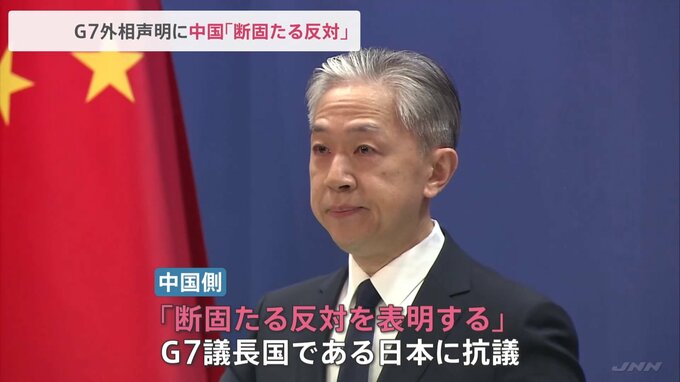 G7=主要7か国外相会合での共同声明で中国に対する懸念が盛り込まれたことについて、中国政府は議長国である日本に抗議したことを明らかにしました。18日発表されたG7の共同声明では、中国に対し「国際社会の責任あ…