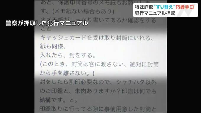 別の封筒を被害者に渡して、自宅に保管するよう伝え、キャッシュカードが入った封筒を持ち帰る手口です。阿部容疑者は、このマニュアル通り男性からキャッシュカード2枚を盗んだ疑いで逮捕、送検されました。