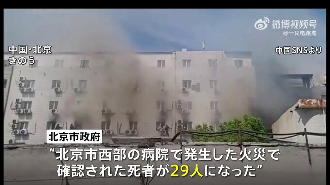 きのう(18日)、中国・北京で起きた病院火災で死者が29人になりました。きのう午後、北京市西部の病院で発生した火災について北京市の政府は先ほど会見し、これまでに確認された死者が29人になったと明らかにしま…