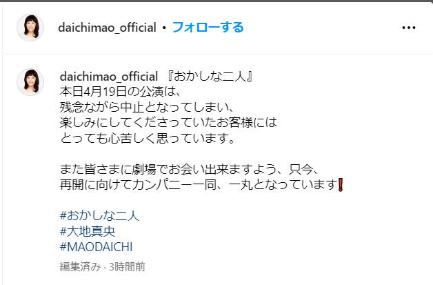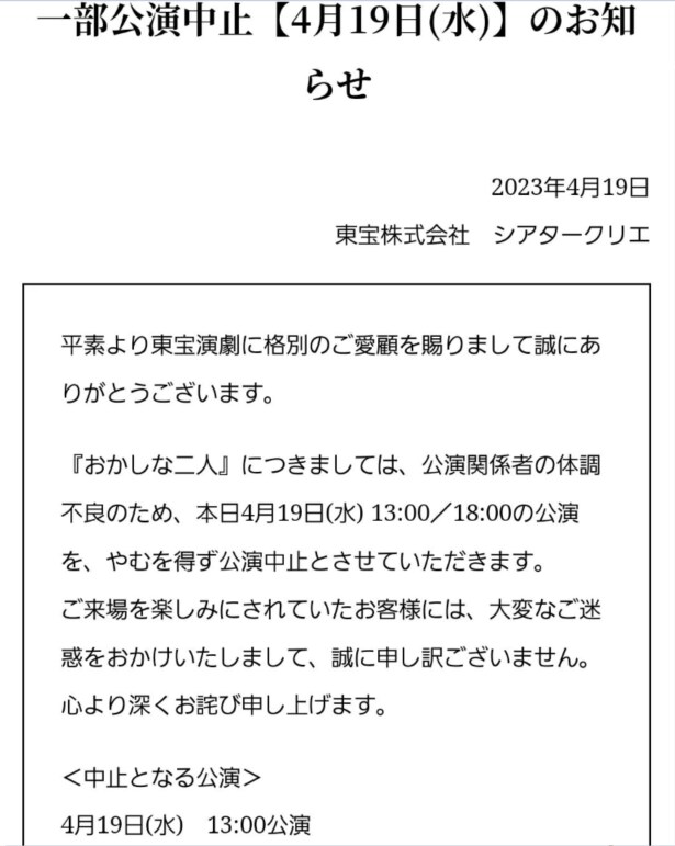 投稿には東宝株式会社と会場であるシアタークリエの連名による「一部公演中止【4月19日(水)】のお知らせ」と題された書面がアップされており「公演関係者の体調不良のため、本日4月19日(水)13:00/18:00の公演を、やむを得ず公演中止とさせていただきます」と記されています。