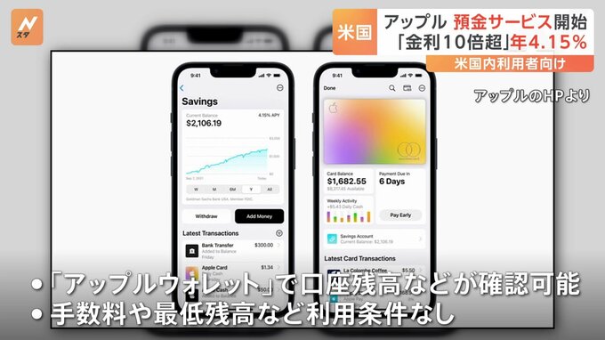 IT大手アップルは17日、アメリカで展開しているクレジットカード「アップルカード」の利用者向けに預金サービスを始めると発表しました。金利は年4.15%で、全米平均の10倍以上としています。預金口座はアメリカ国…