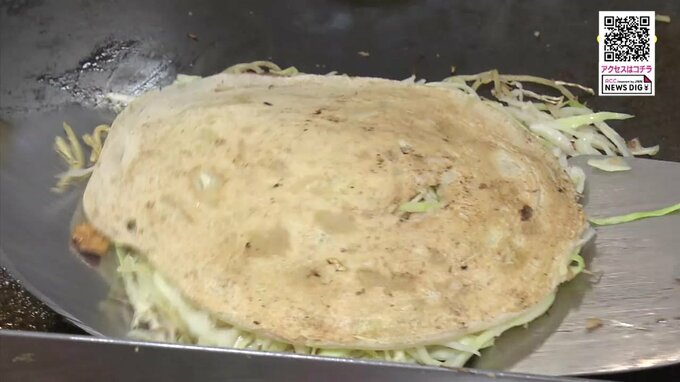 ふつうのお好み焼きに見えますが、ひっくり返すと、そばではなく、パスタ。