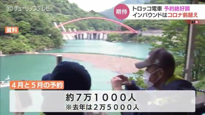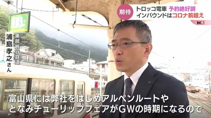 トロッコ電車を運営する黒部峡谷鉄道によりますと、ことしの4月と5月の予約数はおよそ7万1000人と、去年の3倍近くに増加。中でも、去年までの3年間ゼロだったインバウンドの客はおよそ2万2000人と、コロナ前よりも1割増えています。