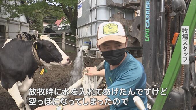 「放牧時にお水を入れてあげたんですけど、もう空っぽになってしまったので、おかわりを補充しています。暑さで普段より喉が渇いているんだと思います」