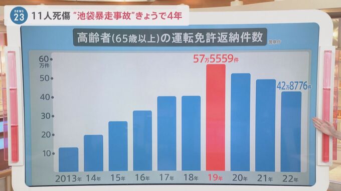 65歳以上の高齢者で運転免許を返納した人の数を見てみると、事故が起きた2019年は57万5000件以上でしたが、どんどん減って2022年は、42万8000件ほどになっている。人数自体が減っています。