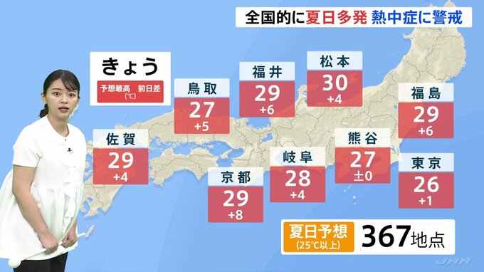 南から暖かい空気が流れ込んだ影響で、全国的に朝から気温が上がっています。25℃以上の夏日になるところも多く、熱中症に警戒が必要です。きょうは30℃近くまで気温が上がるところがあり、熱中症に注意が必要です…