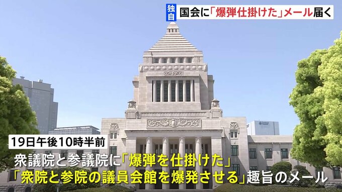 「国会に爆弾とサリン発生装置を設置した」というメールが届いていたことがJNNの取材で分かりました。関係者によりますと、きのう午後10時半前、衆議院と参議院の問い合わせ窓口にメールが届き、「衆議院と参議院…