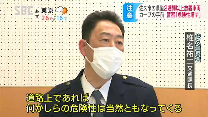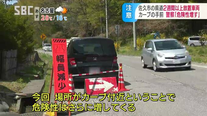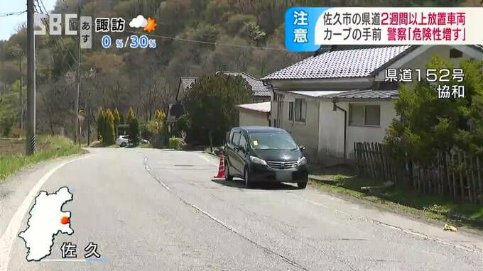 長野県佐久市の県道で、カーブの手前に2週間以上放置された乗用車があり、「危ない」という声が挙がっています。