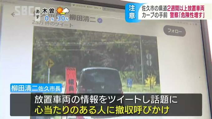 佐久署によりますと現場の県道は交通量は少ないということですが、車両が放置されてから2週間以上がたちます。