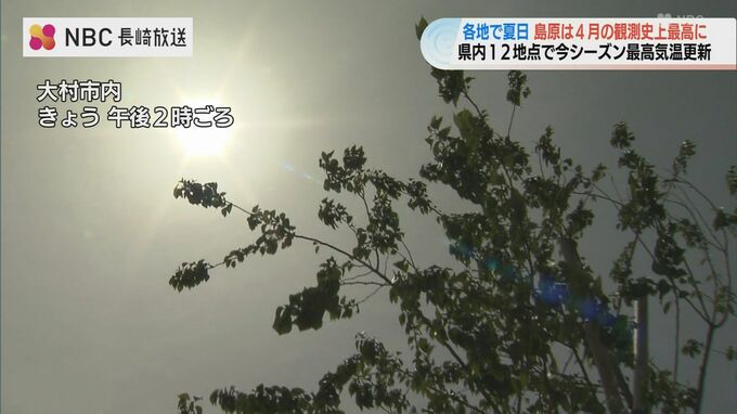 長崎県内は20日、各地で夏日となり、島原市では日中の最高気温が4月の観測史上最高を更新しました。後田記者:「大村公園に来ています。4月とは思えない、日光の照り付けと暑さで、立っているだけでも汗ばんでいま…