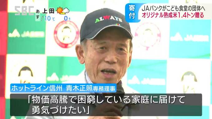 贈呈式には、NPO法人「ホットライン信州」の青木正照(あおき・まさてる)専務理事などが出席し、県内のJAバンクを統括する長野県信連からオリジナルの熟成米およそ1.4トンが贈られました。