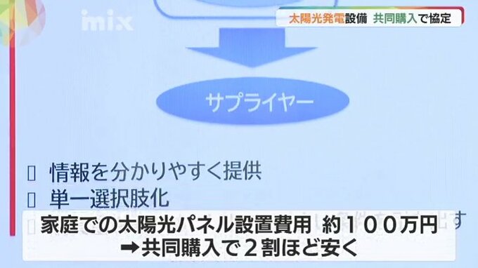各家庭で太陽光パネルを設置する場合、100万円程度の費用がかかるところ、購入する人を集めて買うことで、およそ2割安くなり、契約の手続きも簡単になるとしています。