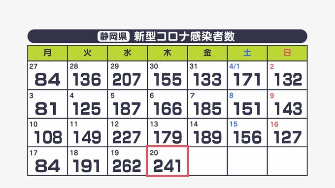 静岡県内では4月20日、新たに241人が新型コロナウイルスに感染したことが分かりました。地域別の感染者数は、静岡市で46人、浜松市で32人、そのほかの市や町で163人となっています。先週の木曜日(4月13日:179人…