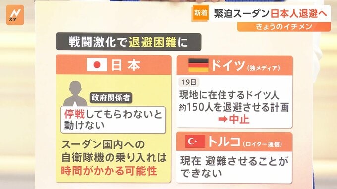 実際にドイツでは19日、現地在住のドイツ人約150人を退避させる計画がありましたが、中止となりました。トルコも現在避難させることができていない状態です。