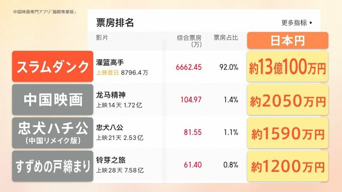 「名探偵コナン」なども爆発的な人気を博しているなか、中国で20日に公開されたのが「THE FIRST SLAM DUNK」。中国では今、興行成績がリアルタイムで確認できるアプリがあります。見てみると「スラムダンク」「すずめの戸締まり」など、さまざまな映画がランクインしています。