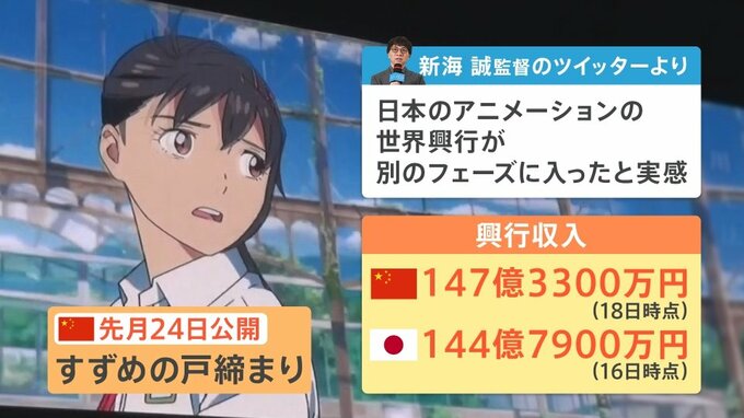 そして3月24日に公開された新海誠監督の新作、「すずめの戸締まり」。着想が素晴らしく、「ここからどう展開していくのか」という新海誠監督の“妙”、“ワザ”がたっぷりと詰まっている映画です。中国での興行収入は147億円を超えました(18日時点)。
