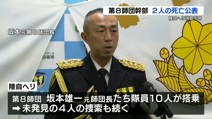 ヘリには第8師団のトップだった坂本雄一(さかもとゆういち)元師団長を含む隊員10人が乗っていて、発見に至っていない4人の捜索も続けられています。