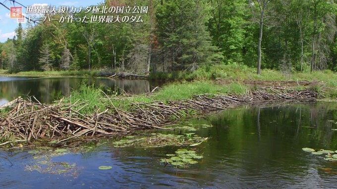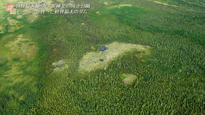 ビーバーは丈夫な歯で木を削り倒し、それを水中で組み上げて巣やダムを作るのですが、ウッドバッファロー国立公園で見つかったビーバーのダムは、実に全長870メートル。あまりにも奥地のため陸路で行くのが難しく、番組ではヘリコプターで空撮したところ、空から見て初めて全体像が分かるスケールの大きさでした。