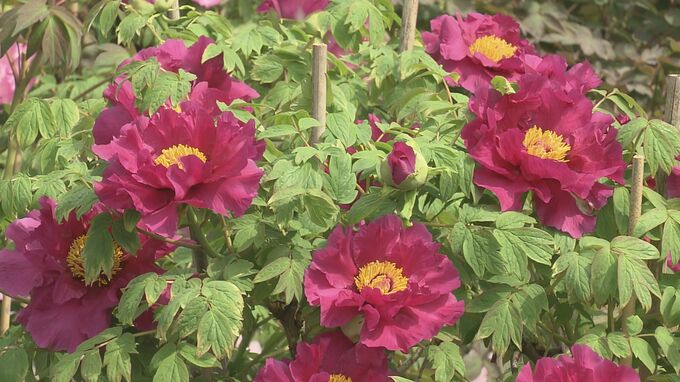 福島県須賀川市の花の名所「須賀川牡丹園」では、早咲きの花が見頃を迎えています。