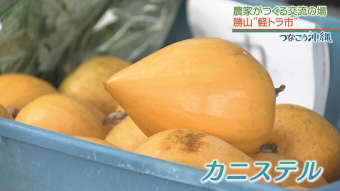 朝市にずらっと並ぶ軽トラック。この荷台の上には朝採れたばかりの新鮮な野菜や果物が並びます。今が旬の新玉ねぎのほか、中南米原産のフルーツ・カニステルといった一風変わった商品も―。